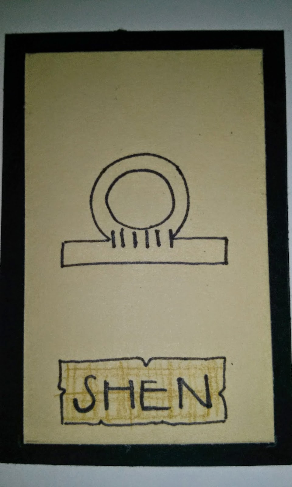 Questo rappresenta l'orbita del sole intorno alla terra ed era quindi simbolo del tempo. Come amuleto posto sopra il morto, prometteva vita eterna finché il sole durava. Nella sfera mortale, esso dice che è importante andare avanti e non guardare indietro agli insuccessi del passato e nemmeno in avanti a immaginati tempi migliori. Il messaggio dello Shen è: il tempo non attende, perciò cogli il momento.